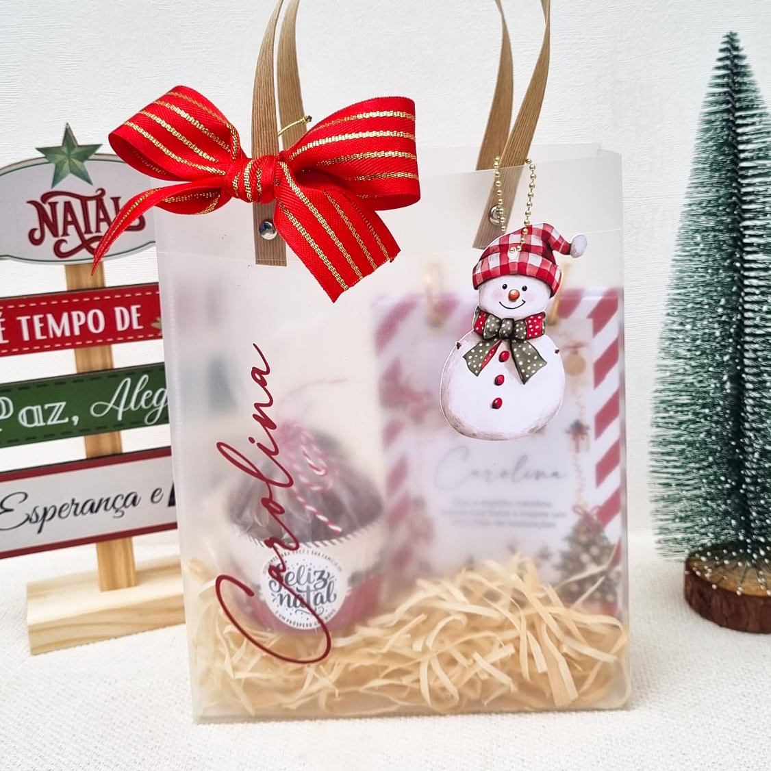 1 Sacolinha com nome personalizado, palha, laço e tag